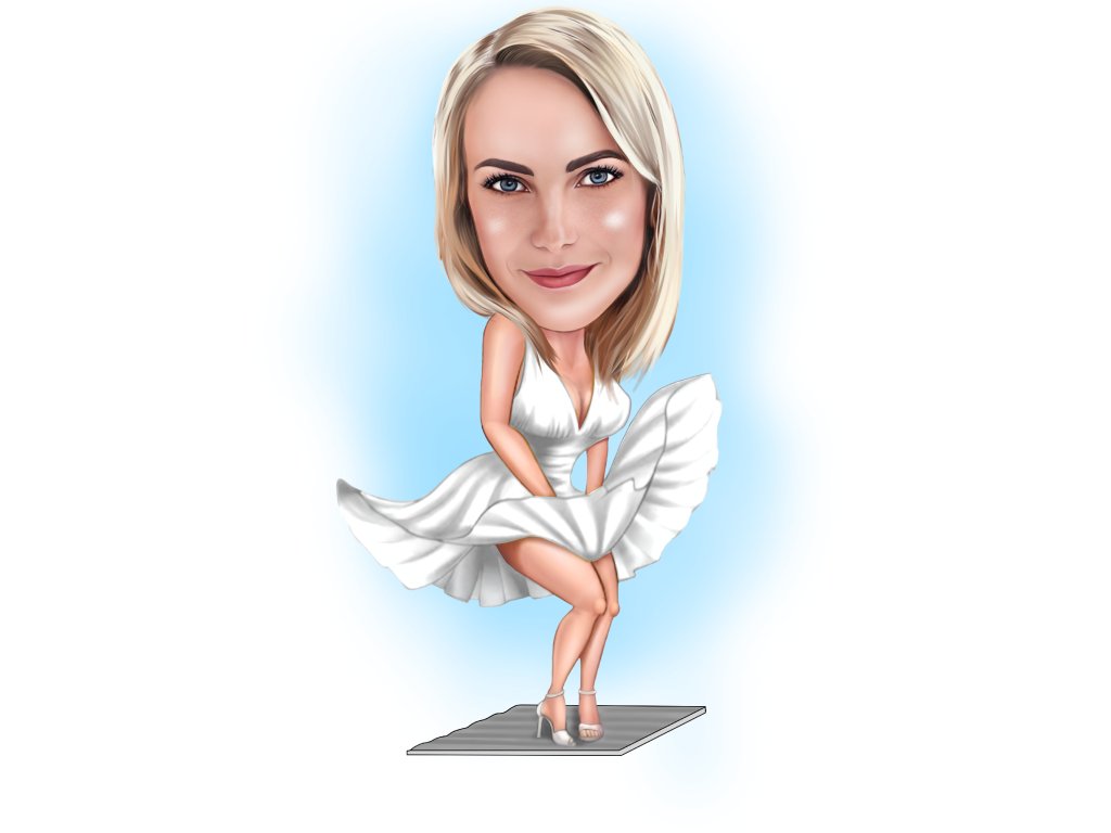 Szeretnéd, ha barátnőd, párod vagy feleséged olyan legendává válna, mint Marilyn? Ebben a karikatúrában fotódat a Hétévi vágyakozás című film felejthetetlen jelenetévé alakítjuk át, ahol Marilyn Monroe a New York-i metró szellőztetése felett élvezi a „légies” pillanatot! Kedvesed arca a jellegzetes elefántcsontszínű ruhában díszíti majd az alakot, amely olyan kecsesen (és talán egy kicsit pajkosan 😉 ) lobog a szélben.