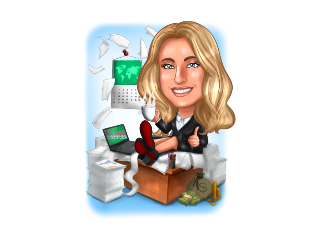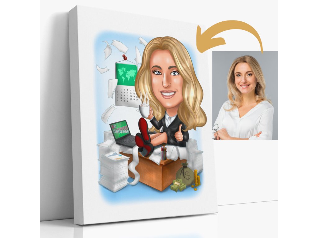 Ez a kézzel festett portré egy modern és sikeres nőt örökít meg - laptop a fontos prezentációkhoz, egy bögre kávé (mert a koffeinmentes kávé egyszerűen nem elég ☕) és persze egy zacskó pénz a földön, mert egy sikeres nő megérdemli, hogy ennek megfelelően jutalmazzák! A karikatúra fotóról tökéletesen megragadja a nő személyiségét, és egy csipetnyi humort visz az irodai mindennapokba.
